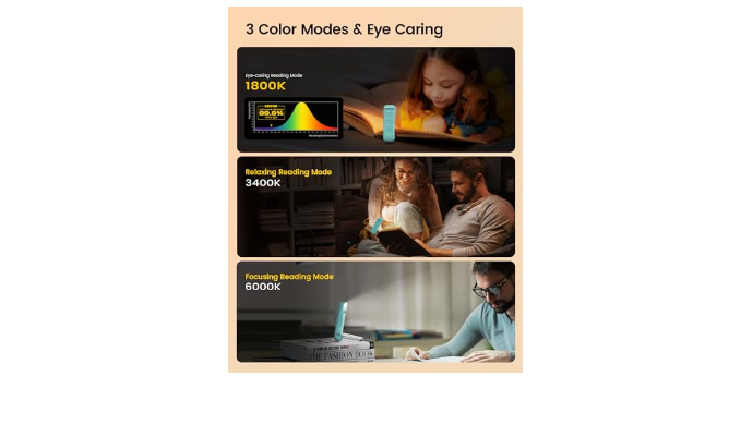 [3 Color Modes & Eye Caring] Unlike other book lights, our tiny reading lights for books in bed has 3 different reading modes: amber mode(1800K), breeze mode(3400K), and precise mode(6000K). Amber mode filters 99.9% blue light to protect your eyes and reduce your eye strain. The breeze mode provides you with a cozy and comfortable reading world for novel reading & poem reading. The precise mode highlights the area clearly and so you can concentrate on every detail of your book.