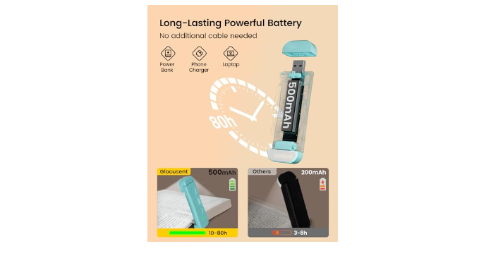 [ USB Rechargeable & Long Lasting] Standard USB rechargeable and compatible with any USB ports on your computer, adapter or USB outlet. This rechargeable reading lamp has a built-in 500mAh battery providing you with 10–80 reading hours (depending on your brightness setting). So you can enjoy your reading for 20 days to 3 months if you read 30 minutes per day, based on your light setting. Besides, there are 4 power indicators to show the power leftover.
