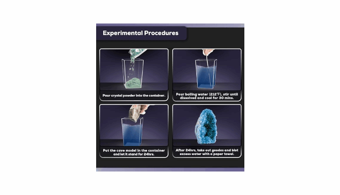 24Hrs Rapid Growth: The science kit for kids offers a 24Hrs journey of wonder,within a day, children will witness stones transforming into beautiful crystal clusters; It comes with guided instructions for anyone looking for how to start