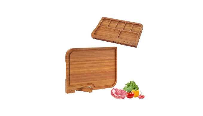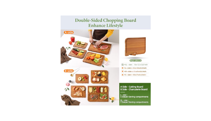 TRUE DOUBLE-SIDED CUTTING BOARD: The rotating stand design allows each wood cutting board to stand, dry on both sides, and care for both sides, and can be used on both the front and back. The front can be used as a chopping board, with deep juice groove to collect liquid from meat, fruit and other ingredients, which keeps the countertop clean and makes food preparation easier.The back serves as a charcuterie board, where the XL and L sizes correspond to 7 and 5 deep serving compartments, which are convenient for a snack, deli or cheese board.