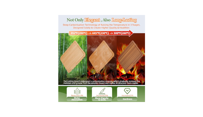 ElEGANT & LONG-LASTING: DEEP CARBON technology, works at temperatures of up to 260°C (500°F), is the most effective way to remove moisture from bamboo. The three-stage process of increasing temperatures allows for precise control of the charring process, resulting in a stable cutting board with less warping and cracking, and a more colourful surface for better kitchen décor. Deep charring also reduces water absorption and makes the board last longer.