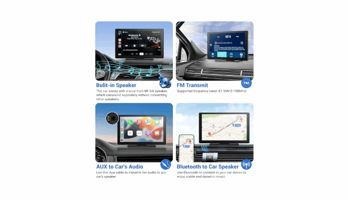 Phone Mirror Link & 4 Audio Output: The 9-inch Carplay Screen for Car supports IOS and Android phone mirroring. The Q9S dual din car stereo with carplay also supports BT audio, local speakers, FM radio and AUX, so you can enjoy clear and stable music in noisy environments, and the carplay sound will bring you a wonderful experience