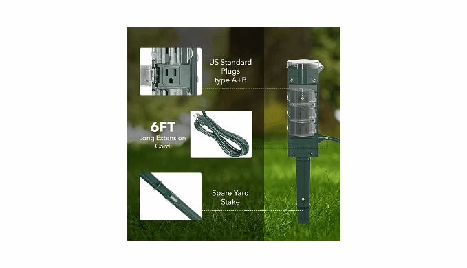 【Weatherproof outdoor outlet】This outdoor yard stake comes with a 12-inch green stake that blends with your garden/lawn. It can withstand quite the snowfall, wind, and heavy rain.And each outlet is safeguarded by an individual waterproof cover, ensuring watertight protection. With a robust design and construction using waterproof materials, this outdoor Power Strip withstands harsh weather and freezing conditions, making it ideally suited for outdoor usage.