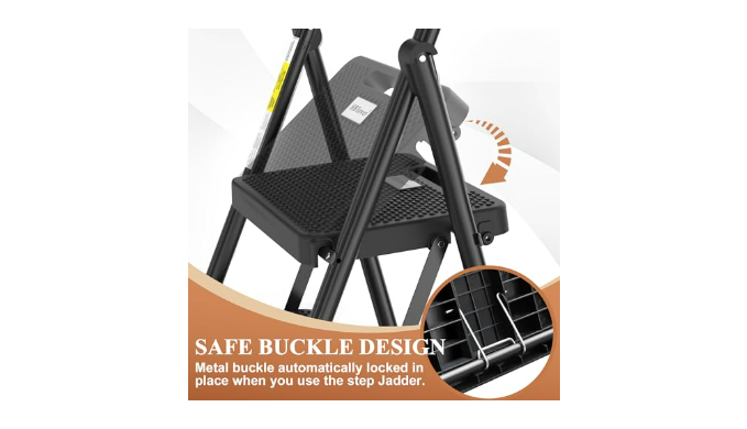 SECURITY AND STABILITY: High-grade steel frame is constructed with strength and reliability. Metal safe buckle automatically locked in place when you use the step ladder. The back cross brace structure reinforce the basic support which will make you feel more safe climbing up the step ladder.