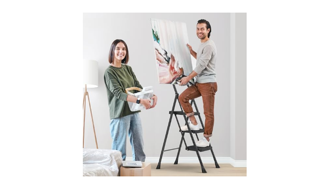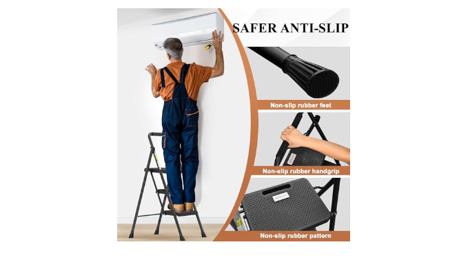 NON-SLIP DESIGN: The 3 step ladder has non-slip rubber handgrip making the stool easy to climb and carry. Wide pedals with non-slip rubber pattern offer heel-to-toe foot support. Big rubber feet fully touch the groud to stays firmly and prevent floors from scratches. (NOTE: Improper use of rubber feet will cause the step ladder to shake left and right. Please make sure that the rubber feet are in full contact with the ground.)