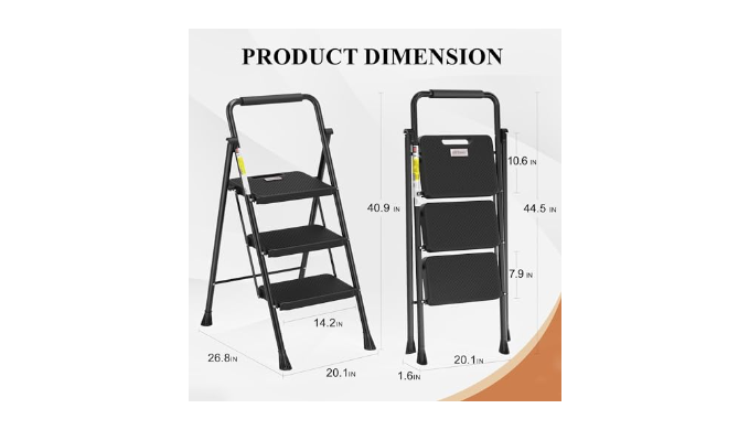 2023 UPGRADE STEP LADDER: Open: 20.1\" x 26.8\" x 40.9\", Folded: 44.5\" X 20.1\" X 1.6\", Net Weight: 11.5 pounds, Maximum Load: 500 pounds. HBTower Safety Folding 3 Step Steel Ladder is made for you!
