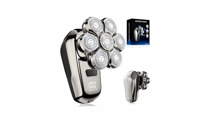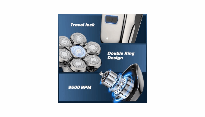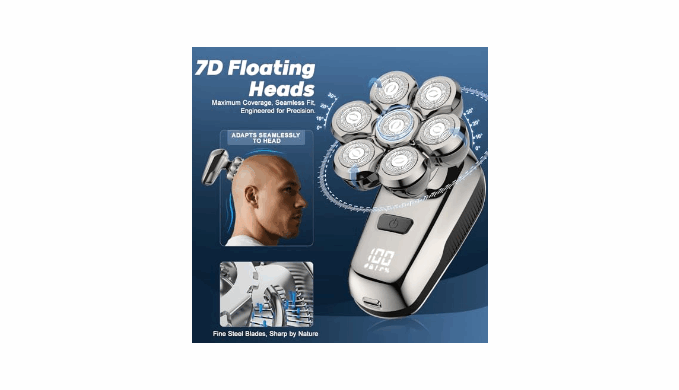 7D Floating Flex Heads: Our electric shaver\'s 7D floating system glides effortlessly across your scalp, face, neck, and body, adapting to every contour. Ultra-flexible rotating blades maximize coverage while dual-layer steel blades precisely capture hair. Dual mesh grids reduce irritation and prevent pulling for a remarkably smooth shave.