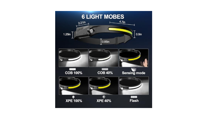 6 Light Modes: Wide beam with COB: strong light and weak light. Side light with XPE: high light and low light. Press and hold for two seconds to strobe (cannot turn on floodlight and spotlight at the same time). Motion Sensor mode. The ultra-bright head lamp adjust the brightness according to your lighting needs