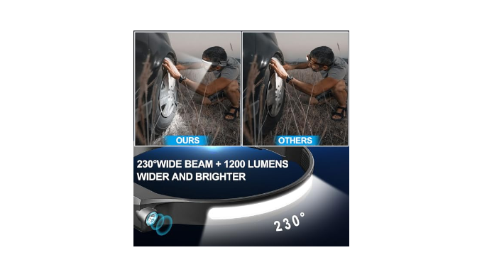 230° Wide Beam Headlight & Spotlight: The Headlamp flashlight 230° wide beam headlight allows you to illuminate the viewing area without moving your head. Unlike traditional headlights, it has a better view, and you can also use its spotlight to focus on specific areas