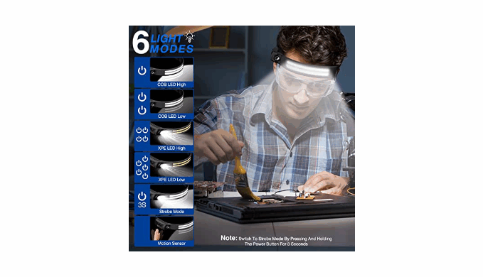 6 LIGHT MODE FOR ALL SCENARIOS ,LONG-LASTING ,LIGHTWEIGHT: Press The Power Button To Cycle Through, Cob Light High, Cob Light Low, Xpe High, Xpe Low, Strobe Mode, Motion Sensor, Long Press The On/Off Button To Transform The Strobe Mode, Then The Xpe And Cob Light Will Flash At The Same Time.The Product Weighs Only 0.14 Lb. Small Size Design Can Be Folded And Easily Put Into The Pocket.No-Bounce Design When Wearing, The Headlamp Lighter Can Stand The Toughest Terrains.