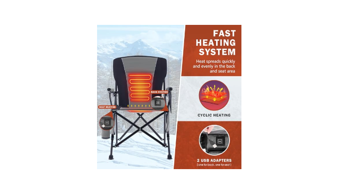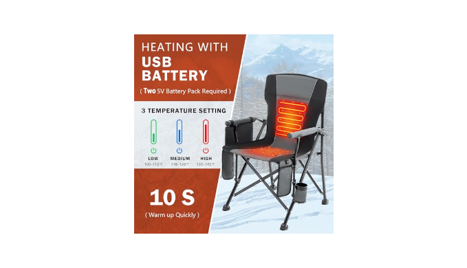 【Dual Heating Zones with 3 Heating Levels】The Heated Folding Chair features USB-powered heating technology ( Output: 5V/2A, battery not included), quickly warms up your back and seat. With 3 adjustable heating levels (green for low, blue for medium, and red for high), this heated camping chair allows you to adjust the temperature according to your needs. The dual-control button allows separate temperature adjustment for the back and hip positions, making it effortless to tailor the warmth to your liking.