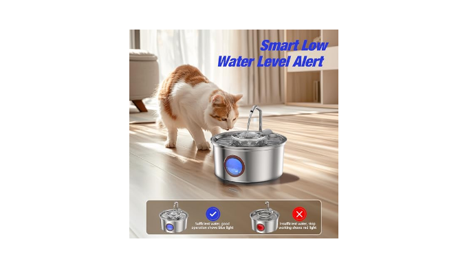 Smart Low Water Level Alert - The Stainless Steel Pet Drinking Fountain is cleverly designed with a clear round window that allows you to easily monitor the water level. When the water level is within the normal range, a soft blue light will illuminate. However, if the water level is too low, a red light will illuminate and stop the pump from operating, prompting a timely refill. This smart design extends the life of the pump.(We offer a 1-year protect for the pump.)