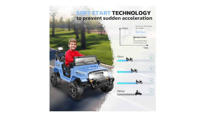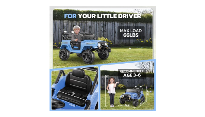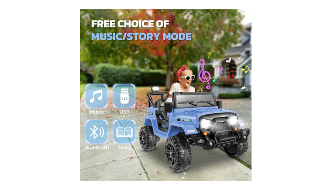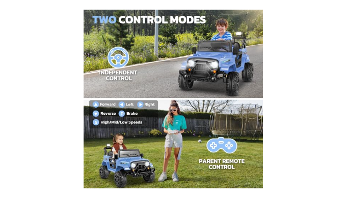 [PARENT REMOTE CONTROL ]:The 12V ride on jeep car equipped with a 2.4G remote control which parent can use to start,stop and control the speed of the electric vehicle.Especially for the kids who can\'t drive the car well.Kids can also operate the kids car with parent remote by themselves.Two driving mode makes driving experience fun and enjoyable.