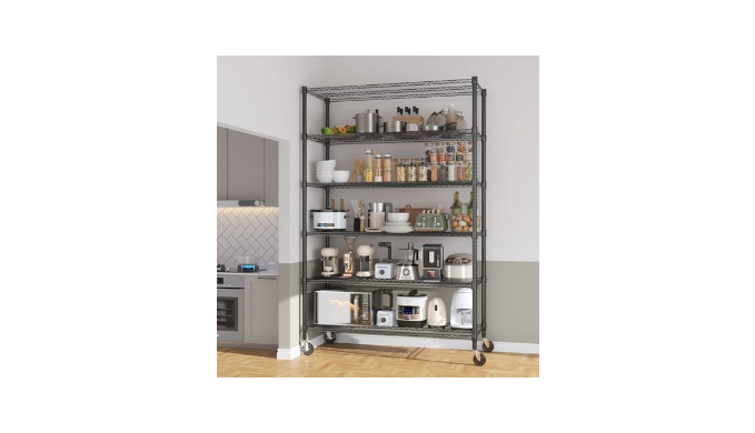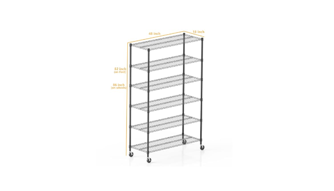 【LARGE SIZE】The size of wire shelf storage rack on wheels is 85\"H X 48\"W X 18\"D (82\"H on feet).This wire shelf can provide additional storage space without occupying too much space.The appropriate size makes the metal shelves for storage suitable not only for kitchens, bathrooms, storage rooms, living rooms, warehouses, basemnet, offices, commercial exhibitions, hotels, supermarkets, etc