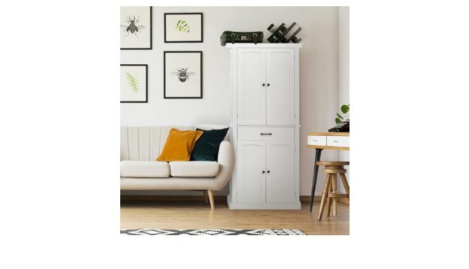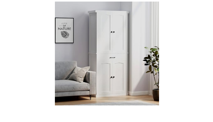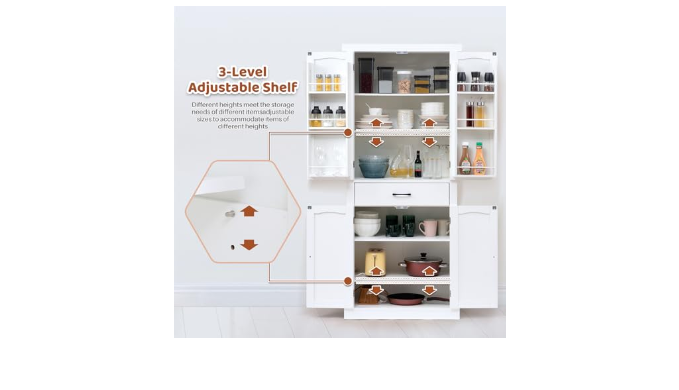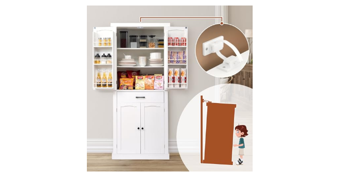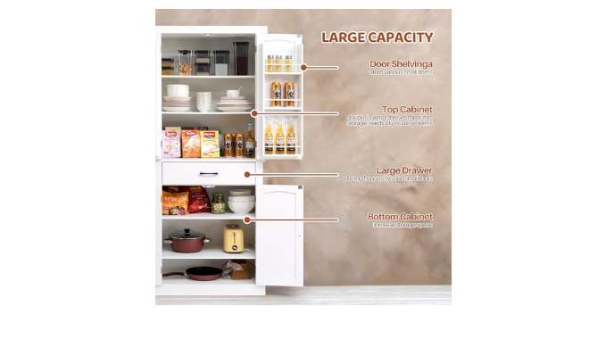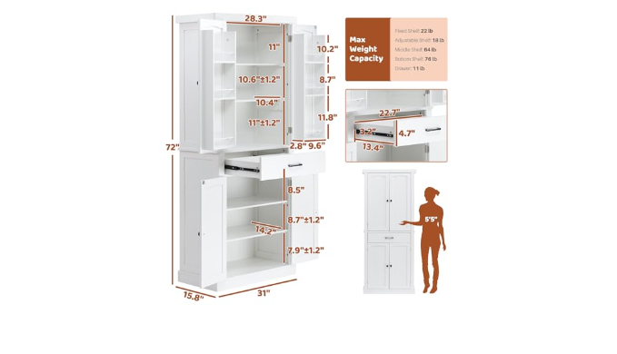 【Large Storage Capacity】The pantry measures 31W x 15.8D x 72H. The large pantry has 4 shelves and 1 large slide-out drawer to hold food, Cutlery and kitchen appliances, including 6 door storage shelves to maximize additional storage space, making it easy to place and access small items such as spices and drinks