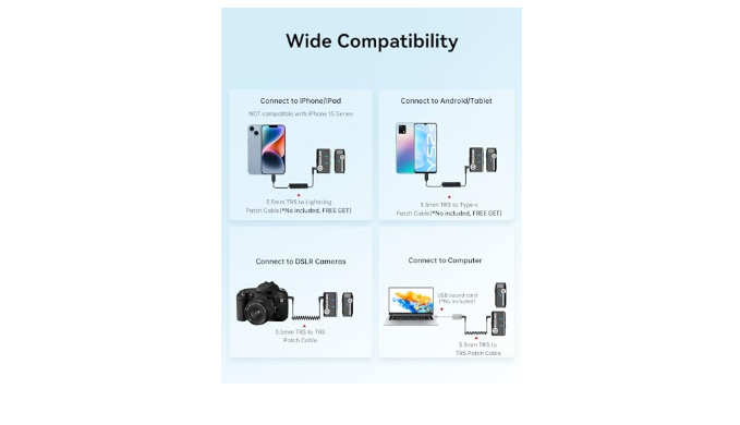 Wide Compatibility: Lark M1 wireless lavalier mic works with all kinds of devices. Included a 3.5mm-TRS-to-TRS cable for all kinds of DSLR cameras, and a 3.5mm-TRS-to-TRRS cable(NOT included) for computers/phones with a 3.5mm port(NOT included).