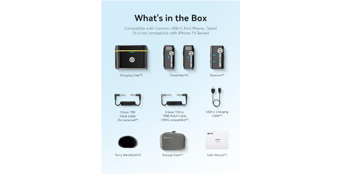 Packing List: Transmitter×2, Receiver×1, Charging Case×1, Windshied×2, 3.5mm TRS Patch Cable (for cameras)×1, 3.5mm TRS to TRRS Patch Cable (TRRS compatible)×1, USB-C Charging Cable×1, User Manual×1, Warantly Card×1, Storage Case×1.