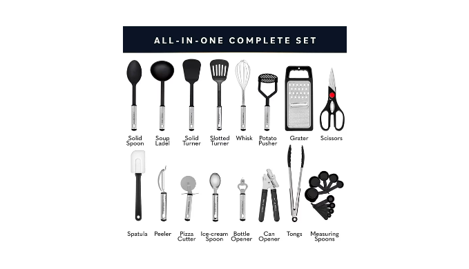 Best value for money around – This fully comprehensive high quality new home essential utensil set is available at an incredibly low price