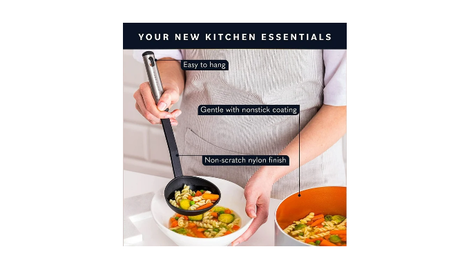 25 nylon cooking utensils – Kitchen Utensil Set includes everything you need to cook that perfect dish. Also makes a great gift since it’s a kitchen essential for new homes.