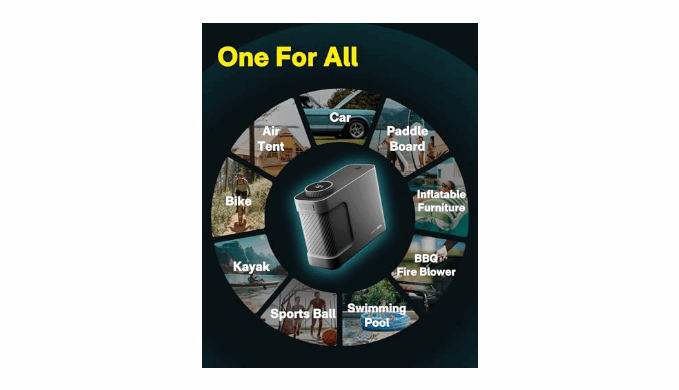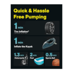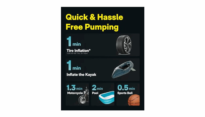 FAST PUMPING & HIGH PRECISION: Powered by an advanced motor, our electric air pump accomplishes pumping tasks quickly. It can inflate a tire from 29-35 psi in 1 minute ( tire specification: 205/55 R16), a kayak in one minute, and a paddle board in fifteen minutes. With a high-precision pressure sensor and smart chip, the air pump automatically stops when it reaches the desired pressure. This ensures accurate and reliable inflation