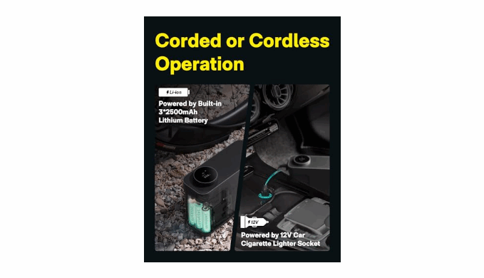 DUAL POWER OPTION: Our tire inflator offers flexibility with both a built-in array of 2500 mAh*3 lithium batteries for wireless operation and a 12V DC car connector for continuous usage (Please Note: In this state, the machine will run normally, but it cannot be charged). Perfect for situations where efficiency and convenience are essential