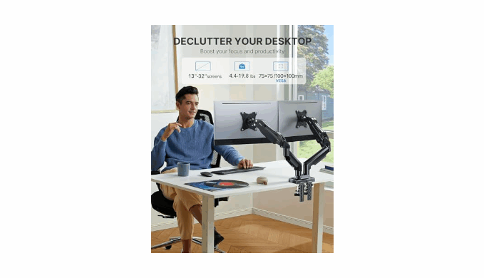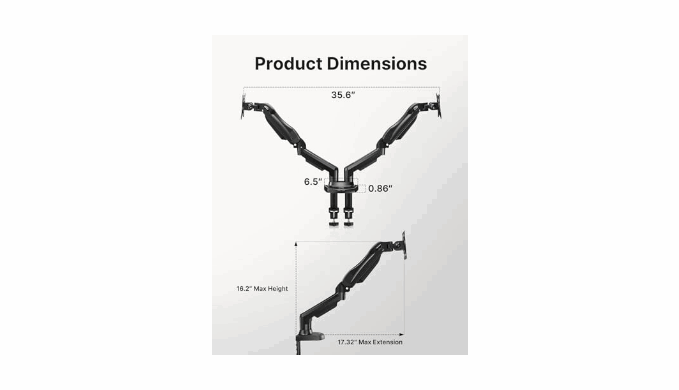 Comfort Is Fundamental - Our dual monitor arm for desk raises monitors to eye level, improving posture, relieving strain on neck & shoulders while increasing productivity levels.Height adjustable, full motion design lets you work in a more comfortable ergonomic position.