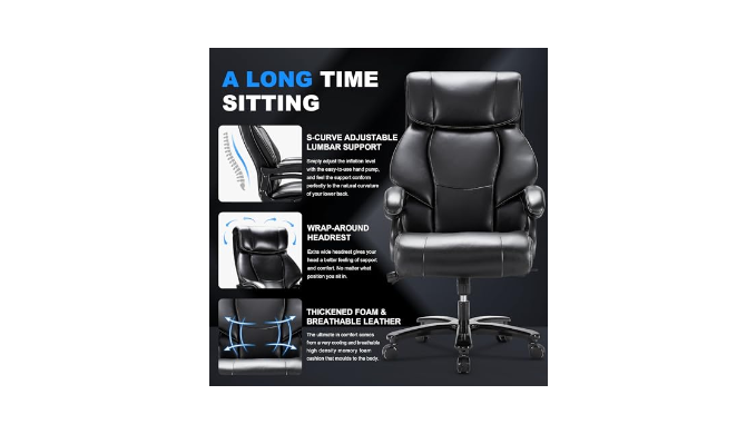 Comfortable Experience: Our most comfortable office chair features an oversized backrest that perfectly supports your body. The thick, soft cushion gives a wonderful floating sensation. No more soreness and fatigue while working on the big and tall chair
