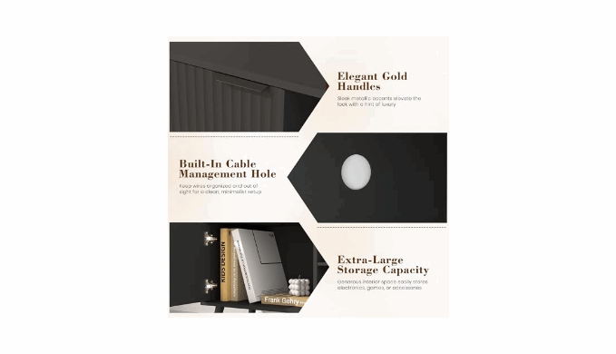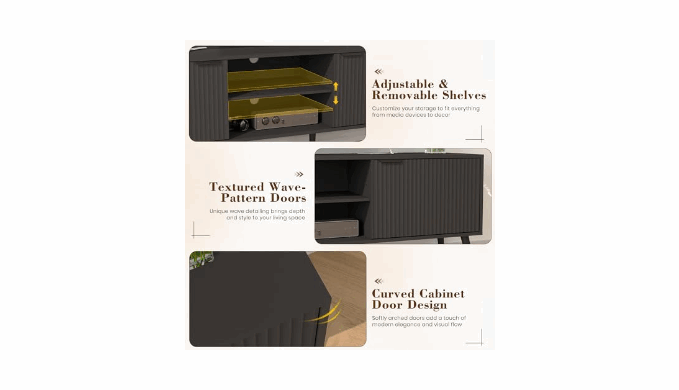 Modern Wave Pattern & Premium Gold Hardware: Designed with visually striking wave-textured cabinet doors, this TV stand brings a fresh, modern aesthetic to any living room. The curved doors enhance ease of opening, while the 4.33” gold-tone metal handles add a refined, high-end touch that complements various interior styles