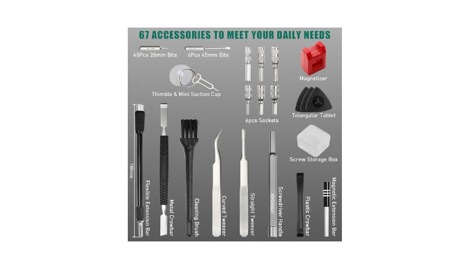 High-quality steel and LED:Magnetic screwdriver set hardness up to 60HRC, strong and durable, meeting the needs of mainstream electronic products and new small appliances disassembly and assembly. 45mm long drill bit, to cope with more complex situations, such as deep holes, narrow spaces