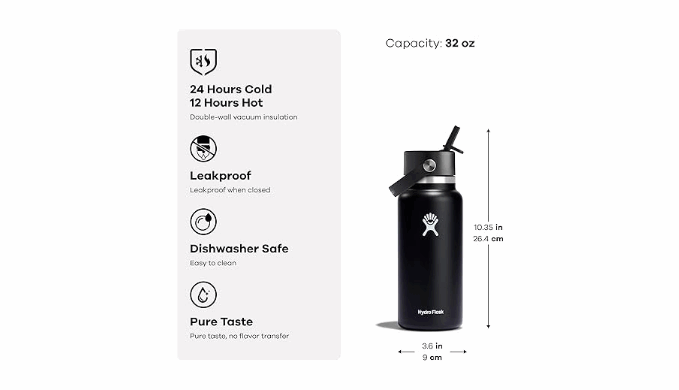- THE BEST BOTTLE: A 32 oz Wide Mouth insulated water bottle with Hydro Flask\'s leakproof Flex Straw Cap—easy to fill, easy to drink. Open it up, add your ice, and flip to sip. The insulated stainless steel keeps it cold for up to 24 hours.