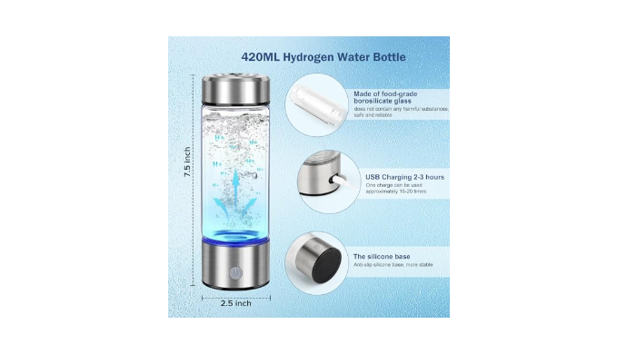 Smooth design, excellent functionality, and large capacity: Our hydrogen water bottle was designed with style and functionality in mind, with a soft EVE pad at the bottom to enhance stability and slip resistance. The USB design allows for seamless production of hydrogen rich water no matter where you go, whether it\'s in the gym, business trips, or leisurely walks. With a capacity of 420 milliliters (size: 7.5 inches * 2.5 inches * 2.5 inches), it maintains sufficient moisture throughout the day and rejuvenates vitality.