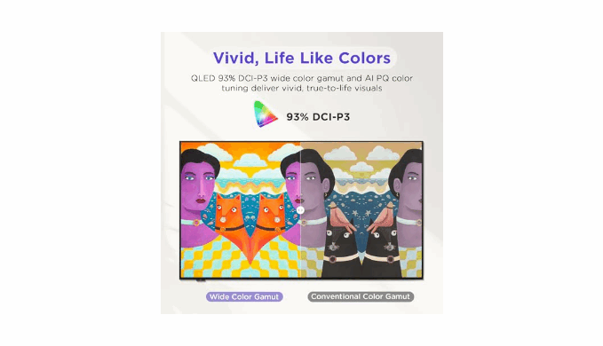 Ultra Wide Color Gamut & 4K QLED Brilliance - Over a Billion Colors: The iFFALCON F75 Series smart Art TV features 4K UHD to immerse you in lifelike visuals. Experience vibrant, true-to-life colors with a 93% DCI-P3 wide color gamut, making every scene pop with exceptional clarity and detail