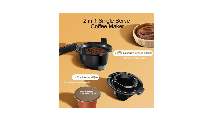 2 in 1 Brewing Function: This single serve coffee maker comes with a reusable k cup hoder and a reusable ground coffee basket, so you have two options to brew coffee either American standard coffee capsules or up to 20g of freshly ground coffee powder. Enjoy a hot, delicious cup of coffee in just 2 minutes, it\'s ideal for busy morning or a quick coffee break.