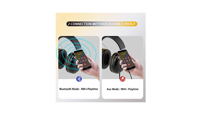 LONG-PLAYING TIME, UP TO 120H+: in Bluetooth mode, the ear protection headphones could afford over 48+ hours of playtime, in AUX mode, up to 120+hours. High-fidelity speakers provide premium sound quality, and integrated microphones for answering calls without moving the headset