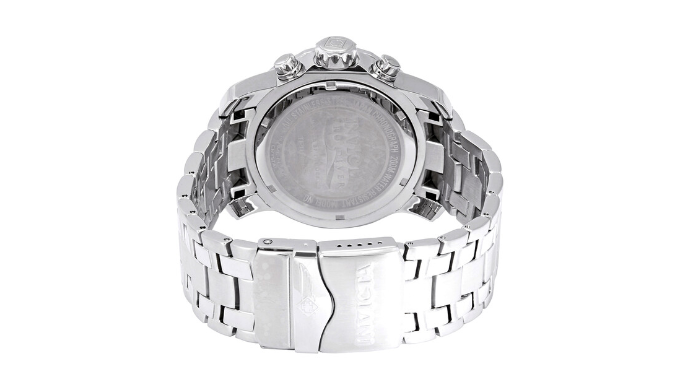 Stainless steel case with a stainless steel bracelet. Uni-directional rotating stainless steel bezel with a black ion-plated top ring. Black dial with silver-tone skeleton hands and dot hour markers. Minute markers around the outer rim. Dial Type: Analog. Luminescent hands and markers. Date display between the 4 and 5 o’clock positions. Chronograph – three sub-dials displaying: 60 second, 30 minute and 1/10th of a second. Ronda caliber 5030.D quartz movement. Scratch resistant flame fusion crystal. Pull / push crown. Solid case back. Round case shape. Case size: 48 mm. Case thickness: 16 mm. Band width: 26 mm. Band length: 9 inches. Deployment clasp. Water resistant at 200 meters / 660 feet. Functions: chronograph, date, hour, minute, second. Pro Diver Series. Sport watch style. Watch label: Swiss Movt. Invicta Pro Diver Chronograph Black Dial Men’s Watch 0069.