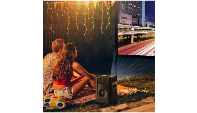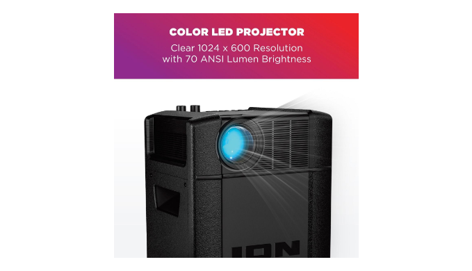 Elevate your entertainment with the ION® Projector Deluxe™ – the ultimate indoor/outdoor projector with a built-in speaker system. This Bluetooth 5.0 compatible powerhouse boasts a high-power 30-watt sound system, creating a cinematic experience for movies, video games, karaoke, and more. With a clear 1024 x 600 resolution and 70 ANSI lumen brightness, enjoy vibrant visuals on an adjustable projection ranging from 30 to 150 inches diagonally. The rechargeable battery ensures approximately 2 hours of video playback or up to 100 hours of music, while the echo effect on the microphone adds an extra layer to your karaoke sessions. Plus, effortlessly play videos from USB or HDMI sources. Transform any space into an entertainment hub with the ION® Projector Deluxe™ – where versatility meets high-quality performance.