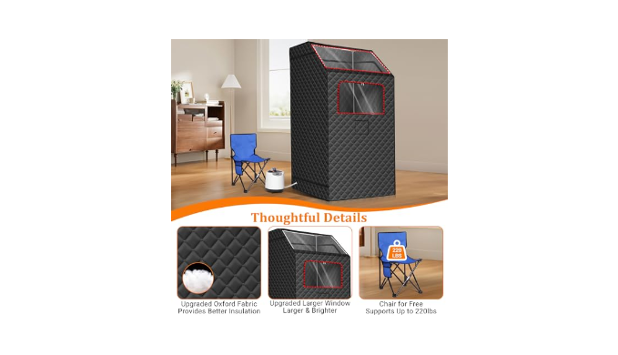 HIGHT-QUALITY 3-LAYER DESIGN - The sauna tent features a three-in-one fabric design, with the outer layer made of 900D Oxford fabric, giving the sauna room a more refined and elegant appearance. The thickness of the middle cotton layer has been increased by 20% compared to similar products on the market, providing better insulation. The innermost waterproof layer reduces heat loss while making the sauna tent easier to clean