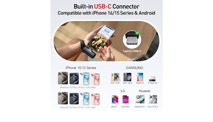 Wide Compatibility: iWALK portable charger is built-in type-C connector, which is compatible with iPhone 16/15, iPhone 16/15 Plus, iPhone 16/15 Pro, iPhone 16/15 Pro Max, iPad, AirPods, and designed for Android phones, such as Samsung Galaxy S24, S23, S22, Z Flip6, Z Fold6, Note, OPPO, Xiaomi, Huawei, Pixel, LG, Oneplus etc.