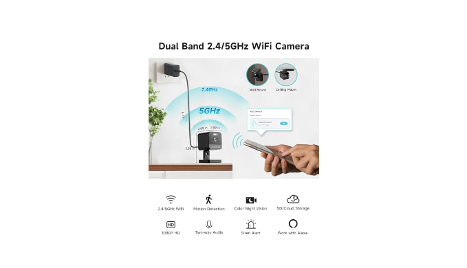 Dual-Band Connectivity (2.4G/5G):The 5G security camera supports both 2.4GHz and 5GHz WiFi for faster, more stable connections. Easily install the WiFi camera on a tabletop or wall mount. Adjust the camera manually to cover your desired angle: 90° left/right and 135° up/down, ensuring flexible placement and clear surveillance.