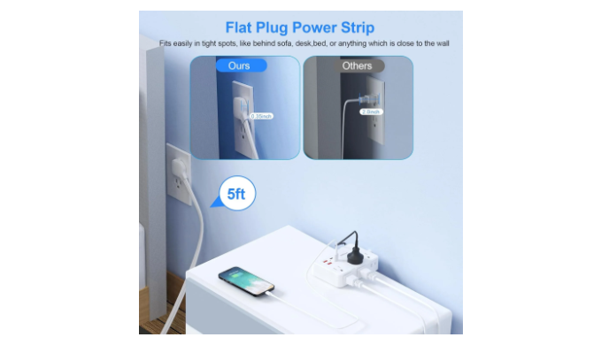 - Features a durable braided nylon jacket for the extension cord, providing flexibility for easy organization. The ultra-slim flat plug design allows it to fit snugly against walls, saving space