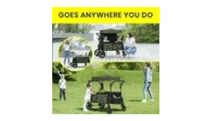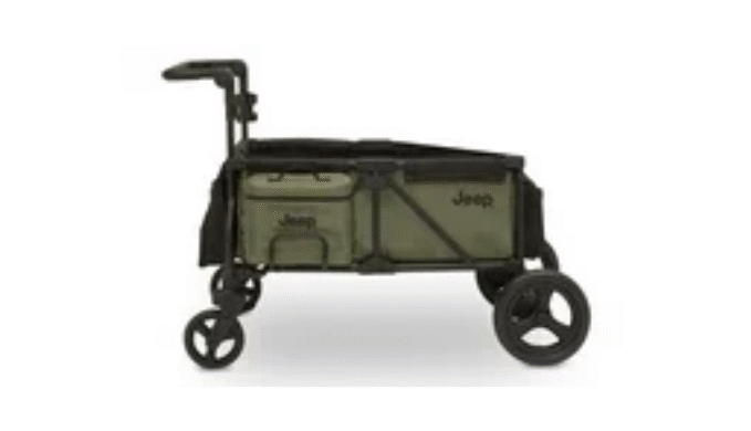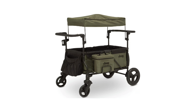 The Jeep Deluxe Wrangler stroller wagon with cooler bag and parent organizer by Delta Children is ready to tackle any family adventure. Designed with all the conveniences of a double stroller and the rugged durability of a wagon, it’s a super-fun crossover that makes any outing easy to take to the park, beach, or sporting event. With so many ways to ride, it’s ideal for kids of varying ages. The UV-blocking canopy protects little ones from the sun while pull-down shades block additional light during naptime. Remove the canopy for open-air cruising. Equipped with more storage than the average stroller, this wagon comes with a removable cooler bag, parent organizer, cup holder, and multiple storage pockets to keep all your must-have travel gear on hand. This wagon is the most off-road capable option ever thanks to its all-terrain puncture-proof airless tires. Easy to maneuver, swivel front wheels allow you to turn and pivot. To store or transport, the Jeep Deluxe Wrangler stroller wagon by Delta Children features a compact fold and quick-release back wheels which make it easier to fit tight spaces. And when your children outgrow the need for a stroller/wagon, use it to haul your gear at the farmers market, while gardening, or at the grocery store.