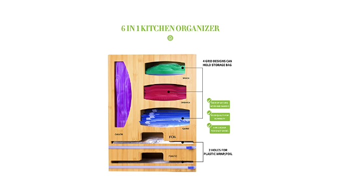 Products Include: 4 baggie organizer and 2 Wrap Dispense, they are a whole. Wrap dispenser with sliding cutter for every slot, it ensures a clean cut. The overall size: 13\'\'x16.5\'\'x3.5\'\'(Includes the height of the cutter). Please make sure your drawer\'s size before purchasing for a proper fit. Please measure your drawer before buying. The product does not require assembly, just place the corresponding things in the guidance of the installation label.