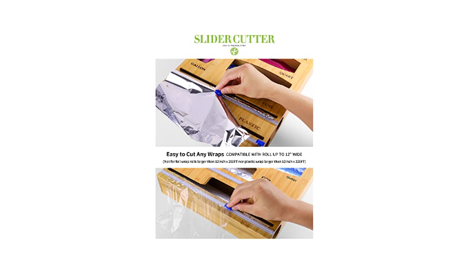 Wrap Dispenser: The aluminum foil dispenser is designed specifically for your different wraps organization. Suitable for reynolds wrap, glad plastic wrap, saran wrap, cut-rite, for plastic wrap, aluminum foil and wax paper. not compatible with rolls that are wider than 12\".
