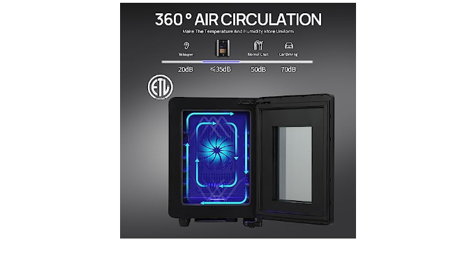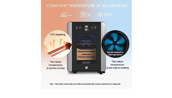KEEP IN GOOD CONDITION: Cigar humidors upgraded with cooling & heating function, adjustable temperature control 54-74 °F. Even if the outside temperature is very low, it can accurately achieve your settings. Note: Humidity is affected by the internal temperature and moisture container; the electric cooler comes with a water box, and you could adjust humidity according to the built-in hygrometer regularly