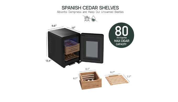 PERFECT STORAGE WITH SPANISH CEDAR WOOD: Humidor cigar box uses Spanish cedar drawer and shelves, it can help mediate humidity and keep out unwanted beetles, offering ideal storage conditions. This temperature-control humidor cabinet can store up to 80 cigars