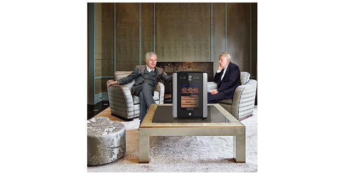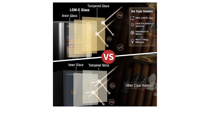 Triple GLASS DOOR: The countertop electric humidor features a modern triple glass door with LOW-E glass, allowing for better insulation from outdoor air and protection from sunlight. The glass elements, as well as the stylish appearance, make the electric humidor more elegant