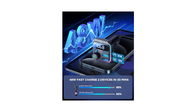 48W Fast Charge: This fm transmitter car bluetooth 5.3 is equipped with 30W PD3.0 and 18W QC3.0 fast charge ports, which can fast charge two devices at the same time and compatible with Samsung/iPhone/Xiaomi /Google and other fast loading protocols