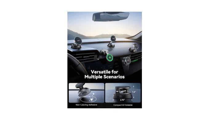 360° Rotation & Dual-Axis Adjustment: The iphone car mount charger features a 360° rotating base and 210° dual-axis folding metal arms, allowing easy angle adjustments to suit your needs. Whether in the car or at the office, switch between portrait and landscape modes effortlessly. Its unique folding design reduces the mount\'s size by 50% when not in use, keeping your space tidy