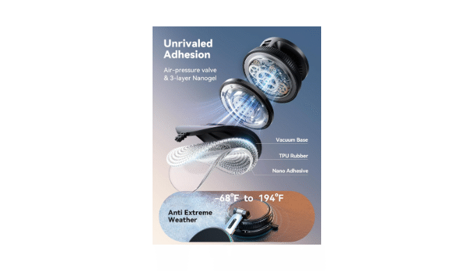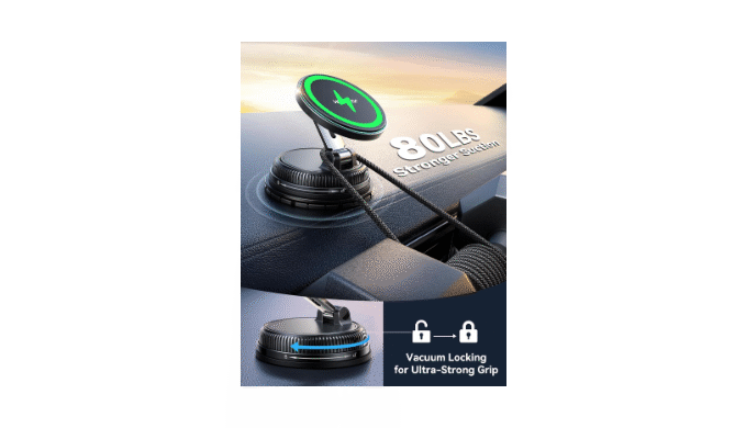 Strong Suction & Stable Hold: This car phone holder charger uses advanced rotating-lock vacuum suction, boosting suction by 45% compared to traditional press-on mounts. It stays stable on bumpy roads or during sudden stops. ( Base Locking: Before installation, rotate the base counterclockwise to unlock. After sticking to the dashboard, rotate the base clockwise to lock, ensuring all air is purged from the base for a secure fit)