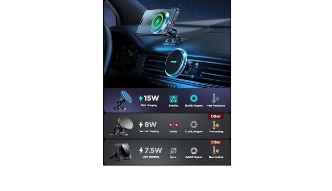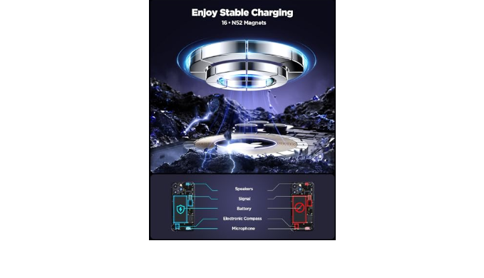 【Powerful and Safe Magnetism】Our Magnetic Wireless Car Charger features an advanced magnetic array that aligns precisely with the built-in magnets in your phone, providing fast, secure magnetic stability.It uses powerful N52-grade magnets to quickly secure your phone in place, even during bumps, turns, and sudden stops.This advanced design delivers a safe and reliable charging experience, making it an ideal solution for use on the road.